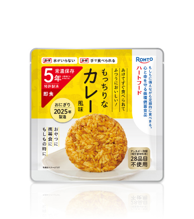 もしもに備えながら定期的に食べきる。心と命を守る循環備蓄食品「ハートフード5年常温保存おにぎり カレー風味」は、調理不要(水がいらない)、食器不要(手で食べられる)、5年常温保存、特許製法でつくられた“おにぎり”です。もしもといつもに備える循環備蓄食として、ユーザビリティ(災害時のQOL向上)、ローリングストックしやすさを考えてつくりました。アレルギー物質(特定原材料等)28品目不使用です。