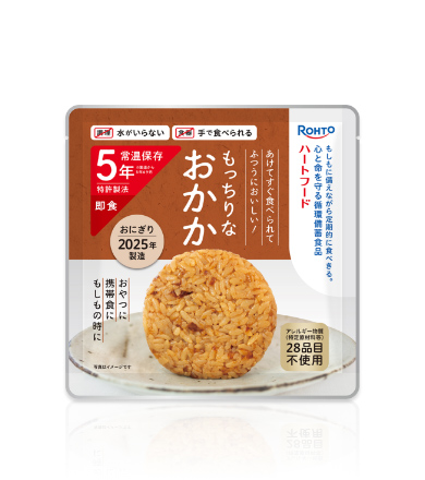 もしもに備えながら定期的に食べきる。心と命を守る循環備蓄食品「ハートフード5年常温保存おにぎり おかか」は、調理不要(水がいらない)、食器不要(手で食べられる)、5年常温保存、特許製法でつくられた“おにぎり”です。もしもといつもに備える循環備蓄食として、ユーザビリティ(災害時のQOL向上)、ローリングストックしやすさを考えてつくりました。アレルギー物質(特定原材料等)28品目不使用です。