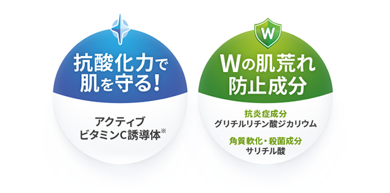 皮脂などによる酸化ダメージから肌を守る! 抗酸化成分とWの肌荒れ防止成分の3つの有効成分で 皮脂により引き起こされる肌トラブルにアプローチ!