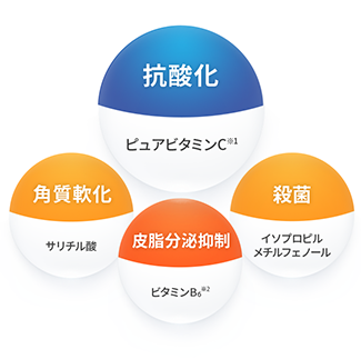 高い活性化力のある抗酸化成分※1や 皮脂分泌抑制成分※2など4つの有効成分を配合。 しみ※3・ニキビを予防、毛穴※4をケア! 清潔感のある肌へと導きます。