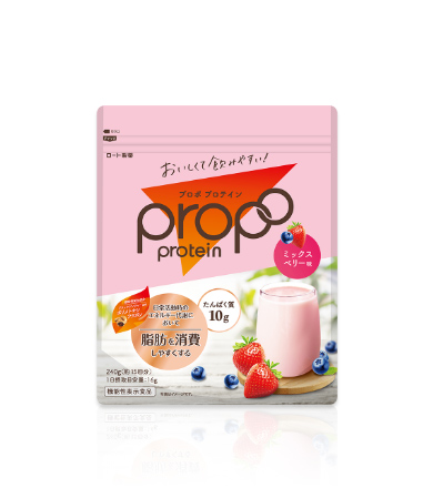 「プロポ プロテイン(ミックスベリー味)」は、日常活動時のエネルギー代謝において、脂肪を消費しやすくする機能と、BMIが高めの方の腹部の脂肪を減らす機能があることが報告されている植物由来成分